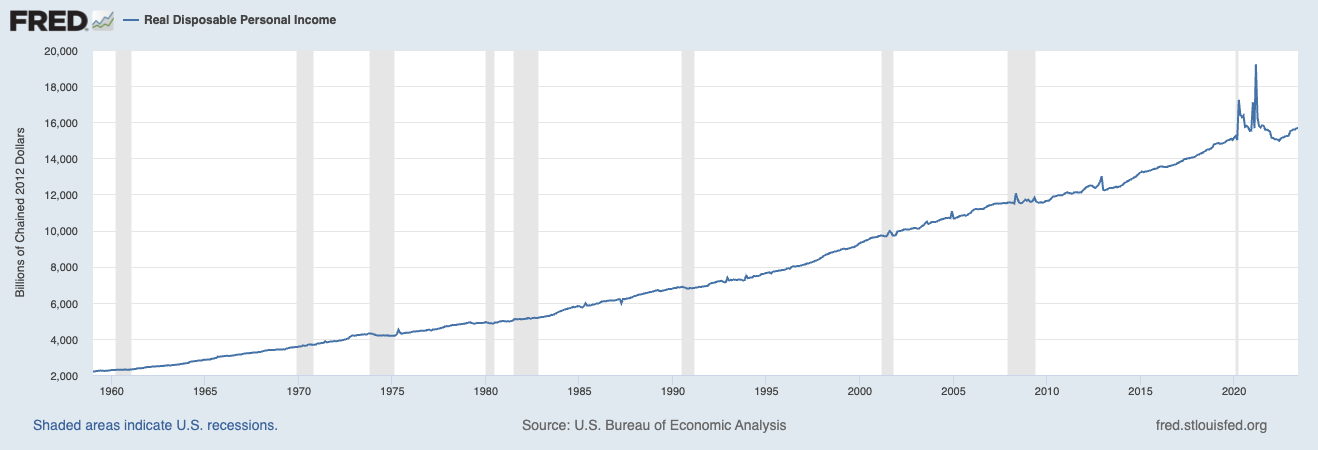 U.S. Bureau of Economic Analysis, Real Disposable Personal Income [DSPIC96], retrieved from FRED, Federal Reserve Bank of St. Louis; https://fred.stlouisfed.org/series/DSPIC96, July 31, 2023.